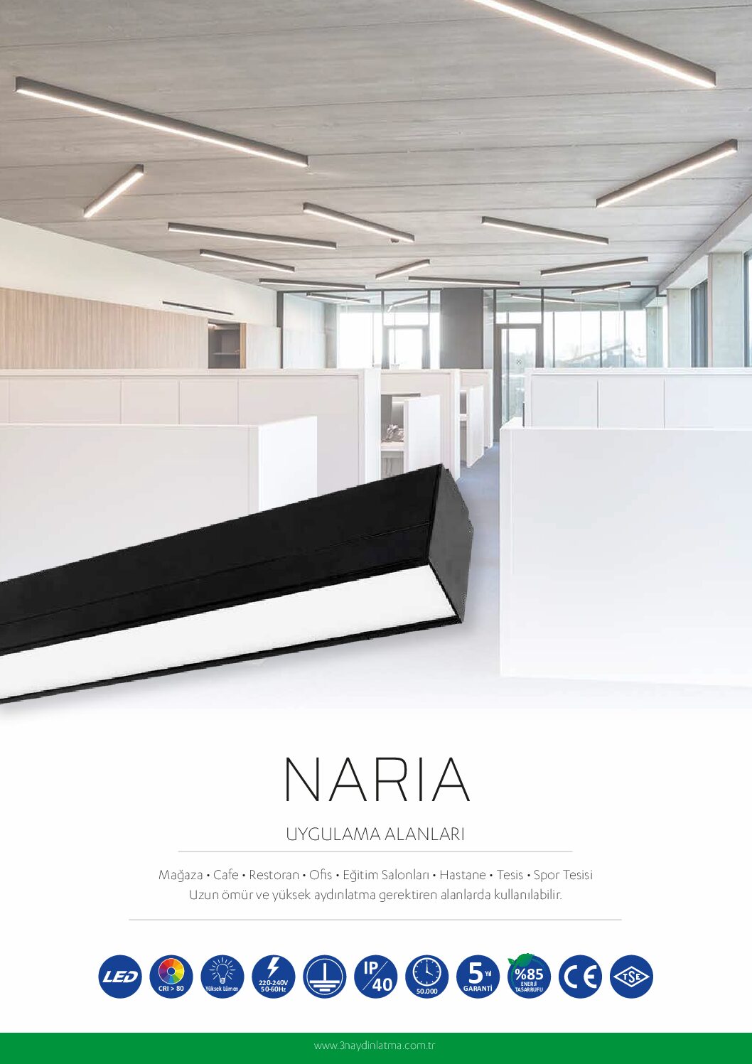 | Opsiyonlar | Gövde Renk Seçenekleri: RAL9016 / RAL7001 Uygulama Seçenekleri: Sıva Üstü / Sarkıt Renk Sıcaklığı: 3000K / 4000K / 6500K Acil Kit – DALI |